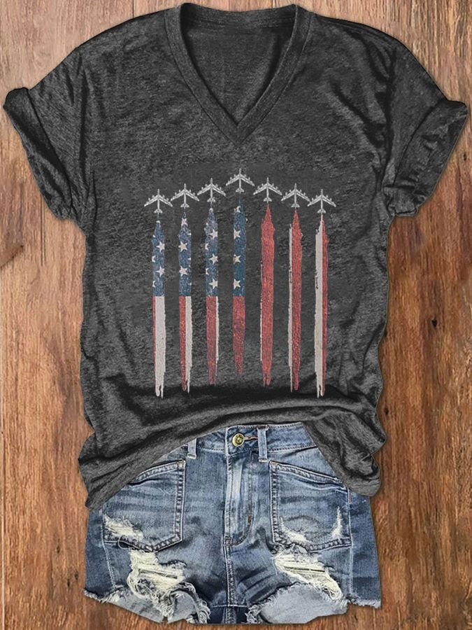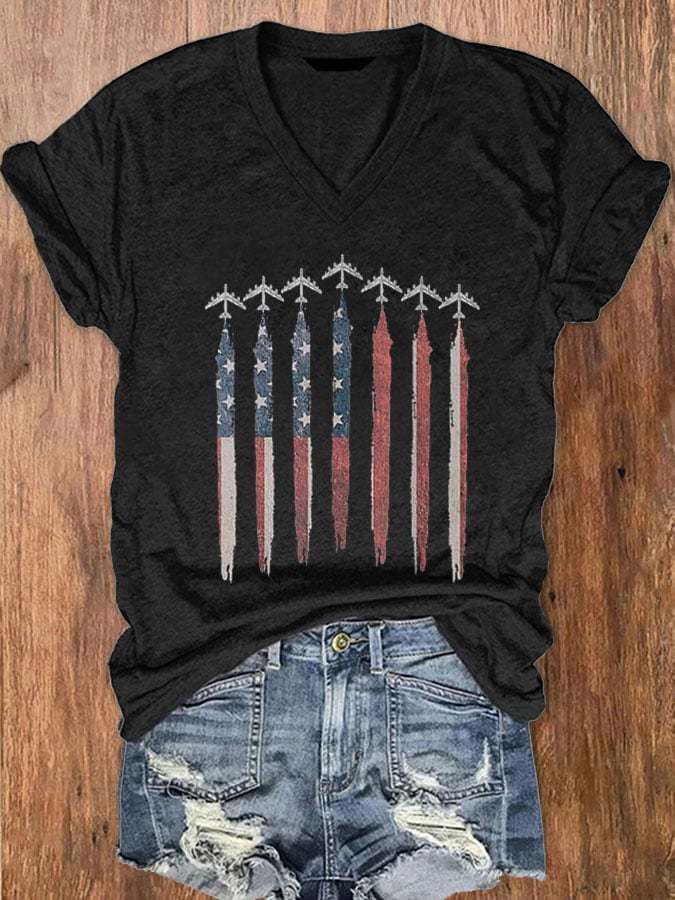Women's Independence Day Airplane Print V-Neck T-Shirt