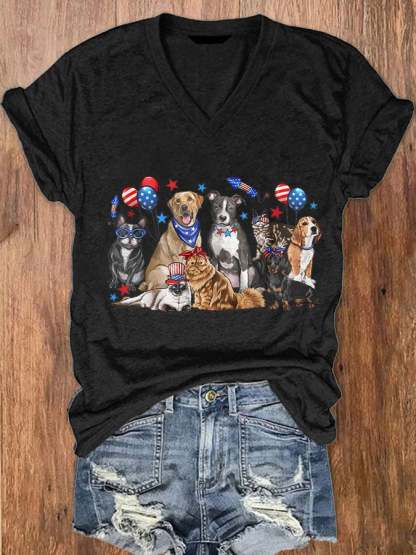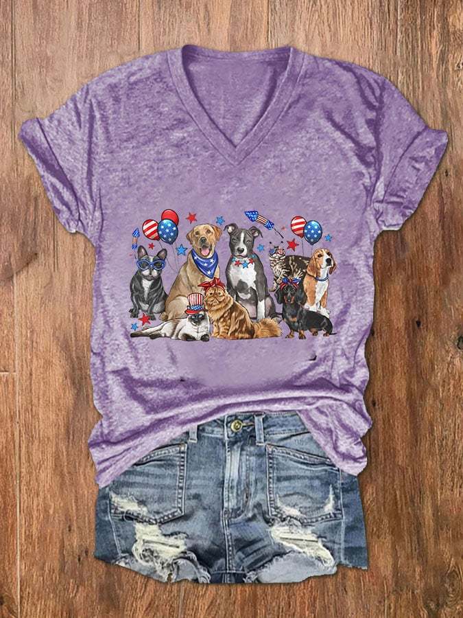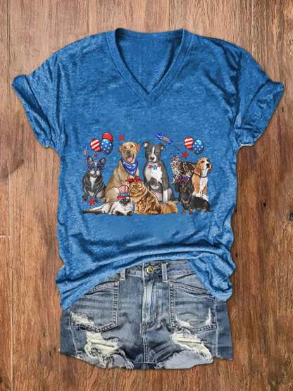 Women's Independence Day Dogs Print V-Neck T-Shirt
