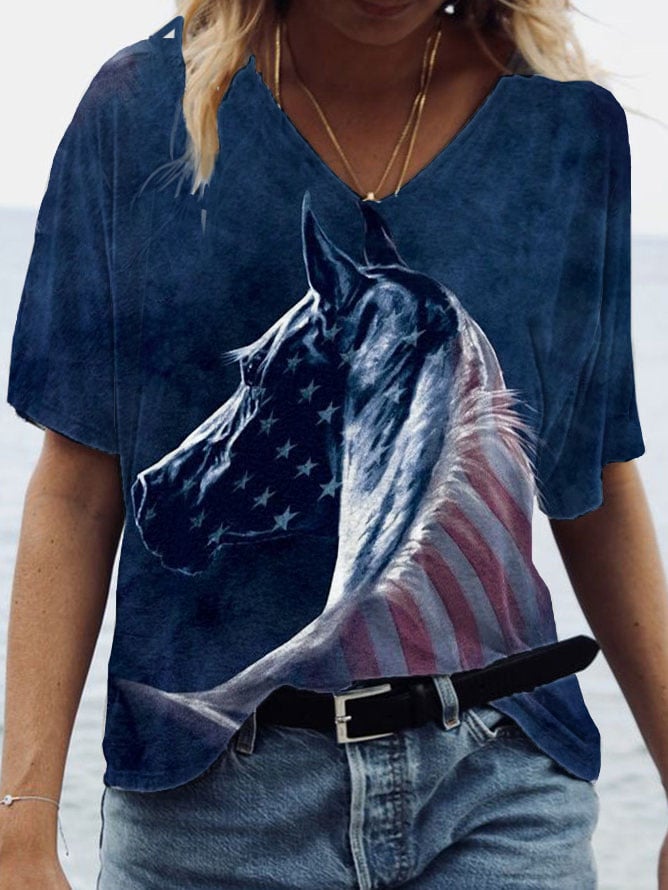 Women's Independence Day Flag Horse Print V-Neck T-Shirt