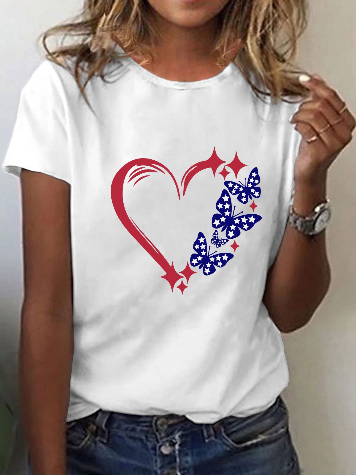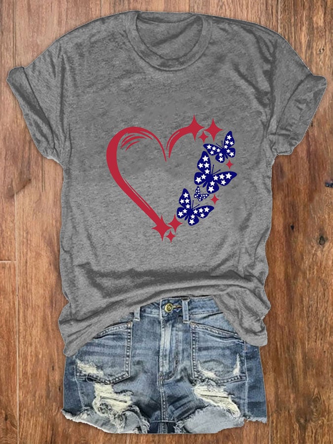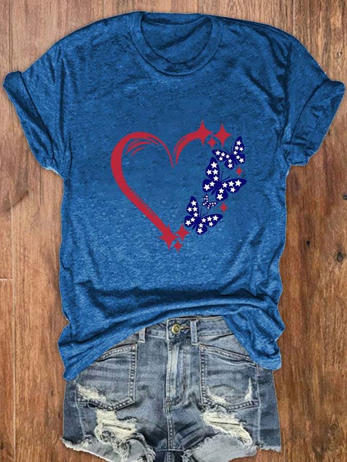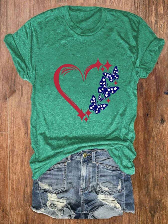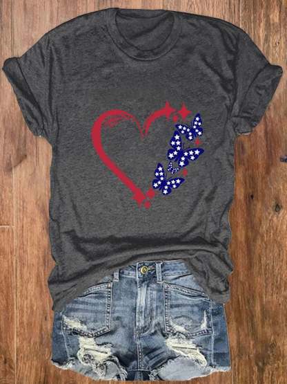 Women's Independence Day Heart Butterfly Print T-Shirt