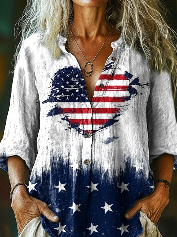 Women's Independence Day Heart Flag Print Casual Cotton Linen Shirt