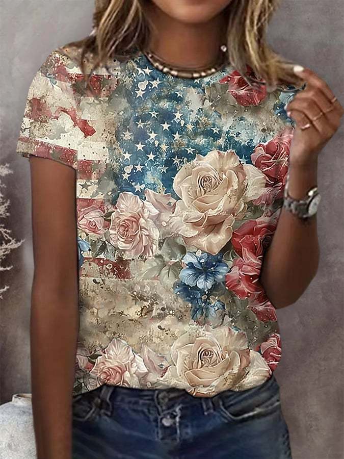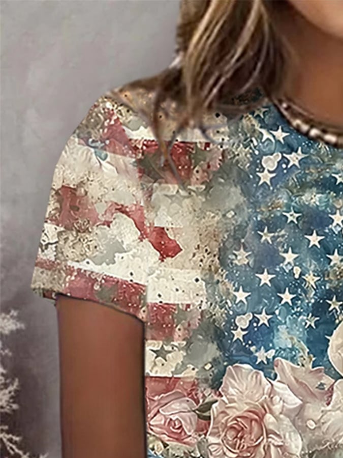 Women'S Independence Day Round Neck Retro Floral Print Casual T-Shirt