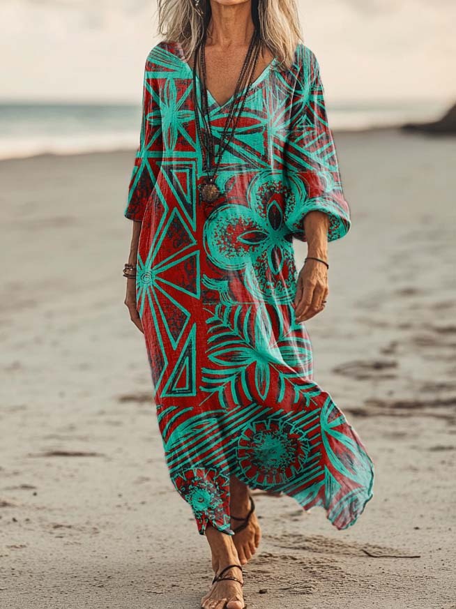 Women's Irregular Line Floral Art Print Pocket Cotton Dresses