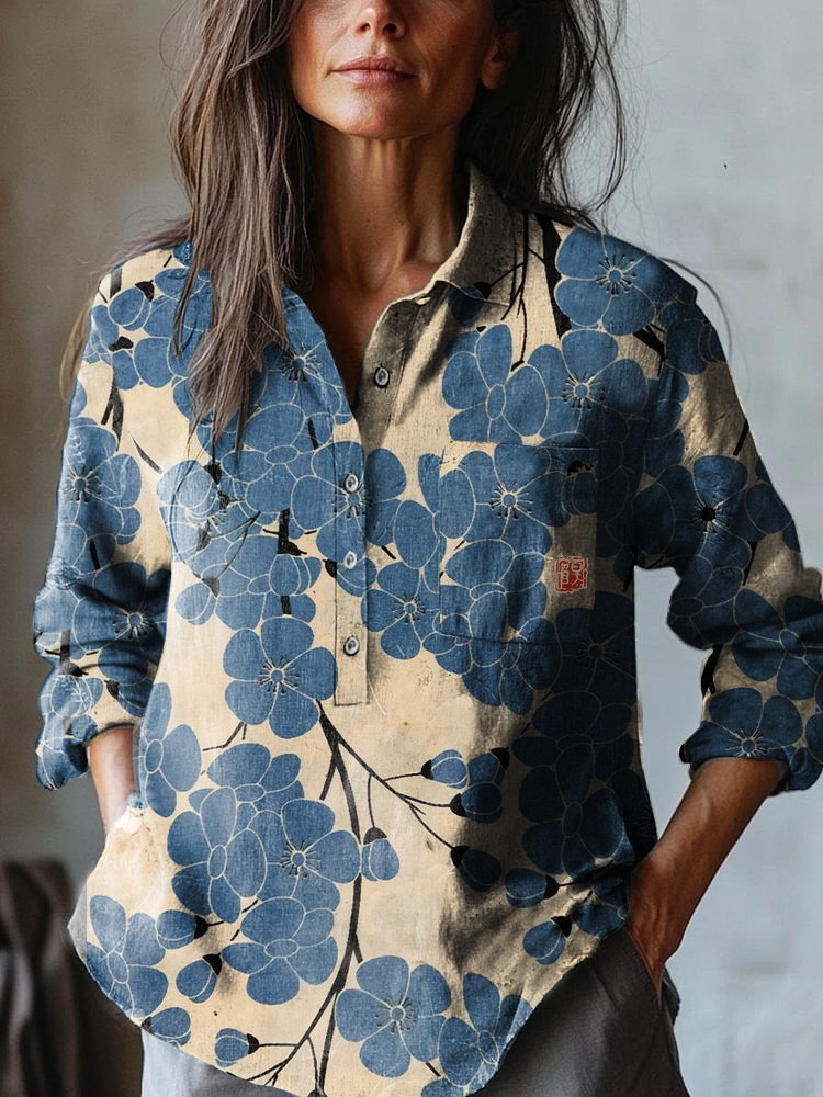 Women's Japanese Classic Blue Plum Blossom Art Print Casual Cotton And Linen Shirt