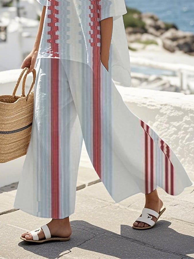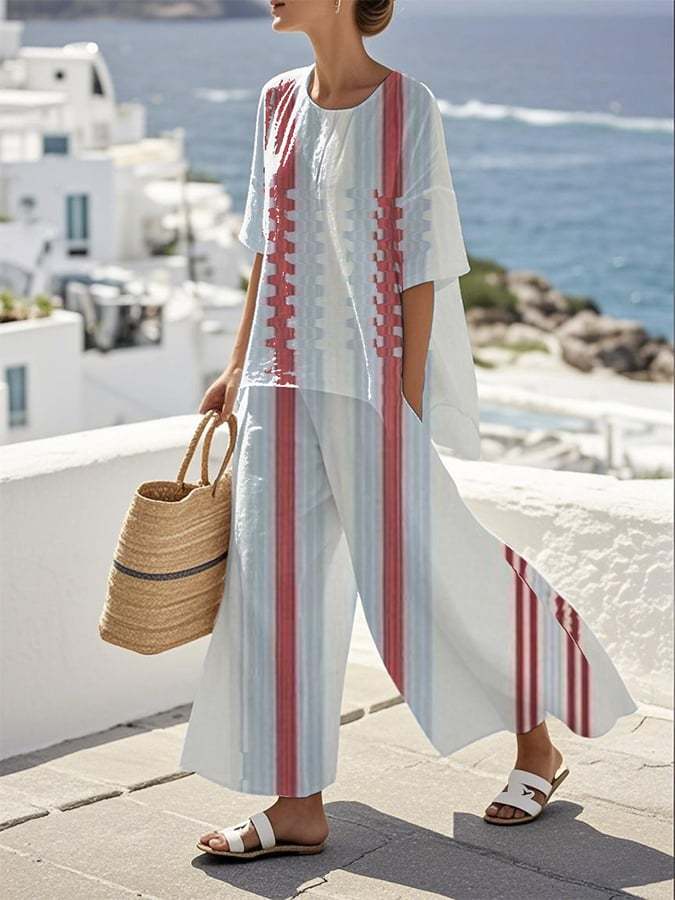 Women's Loose Round Neck Striped Contrast Color Pants Set