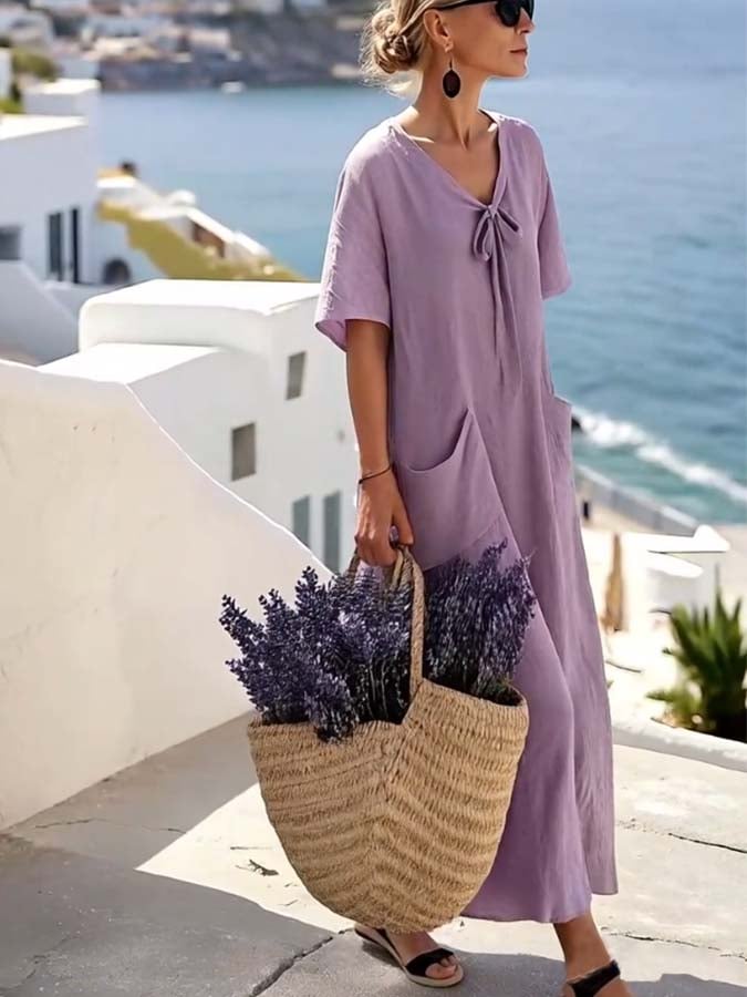 Women's Loose Solid Color Tie V-Neck Pocket Dress