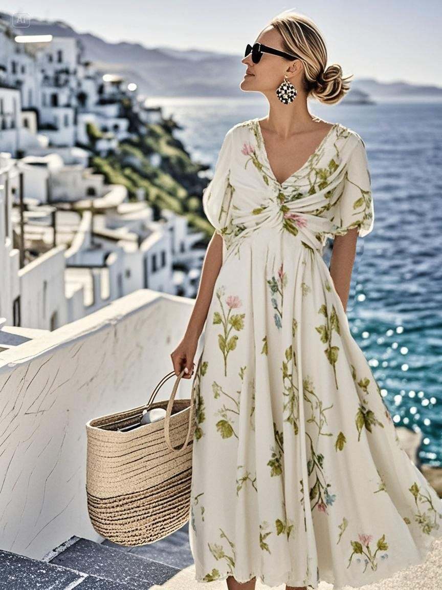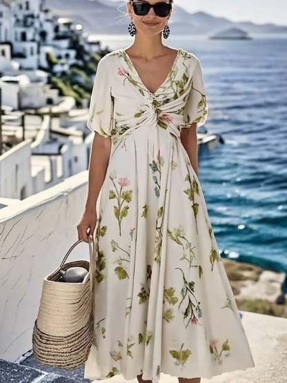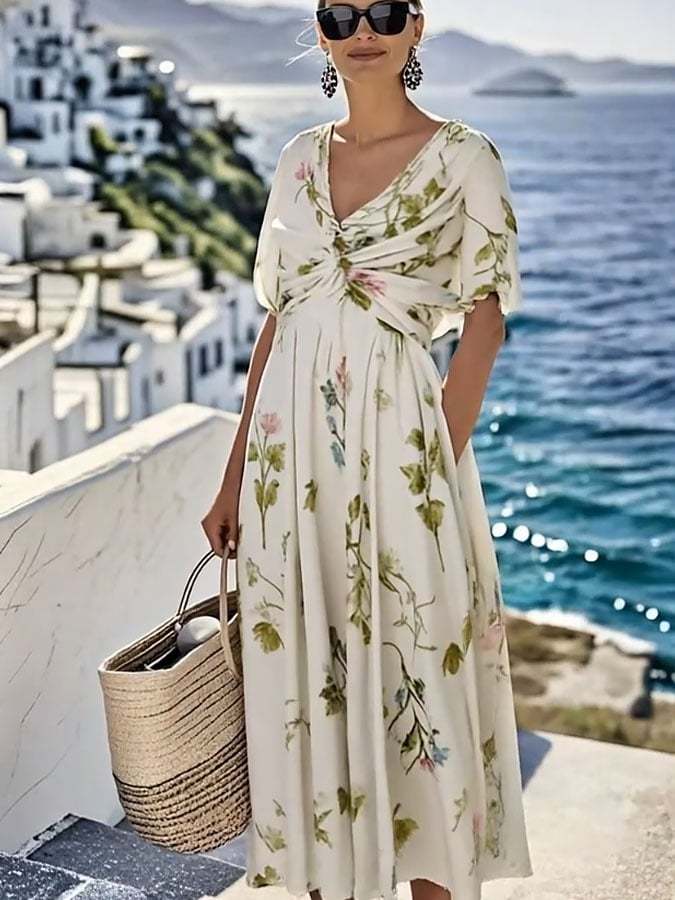 Women's Loose V-Neck Short Sleeve Floral Print Dress