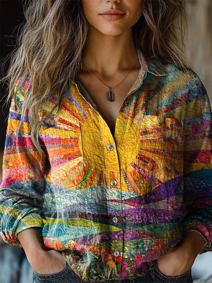 Women's Lovely Sun Floral Patchwork Pattern Art Print Casual Long Sleeve Comfortable Cotton Shirt