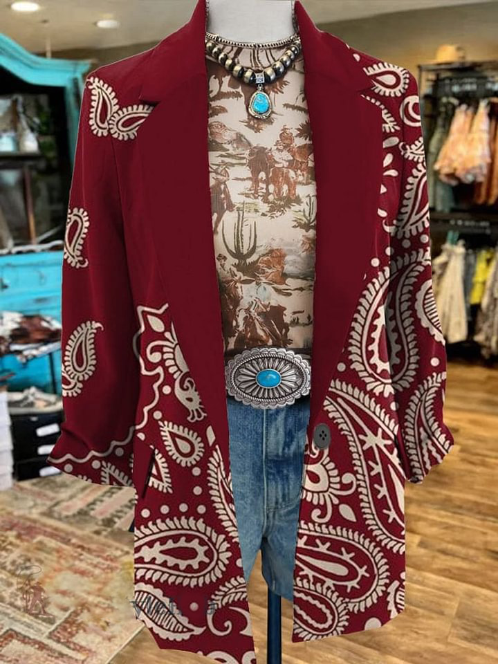 Women's Maroon Vintage Cashew Flower Print 3/4 Sleeve Casual Blazer