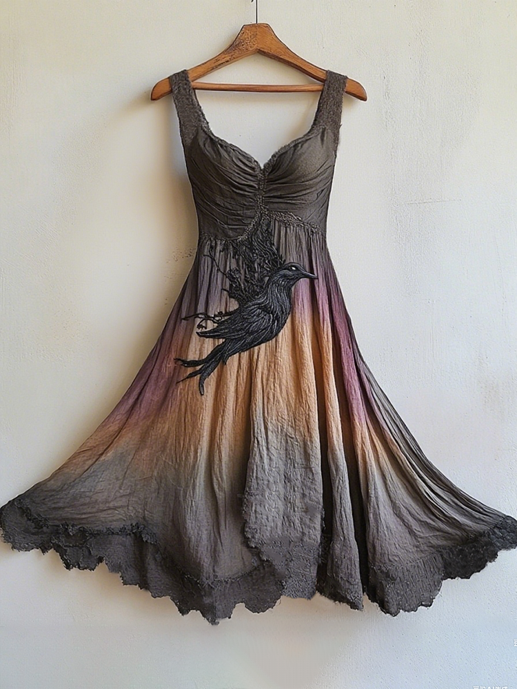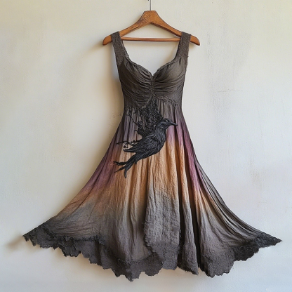 Women's Nordic Mythology Crow Gradient Linen Midi Dress