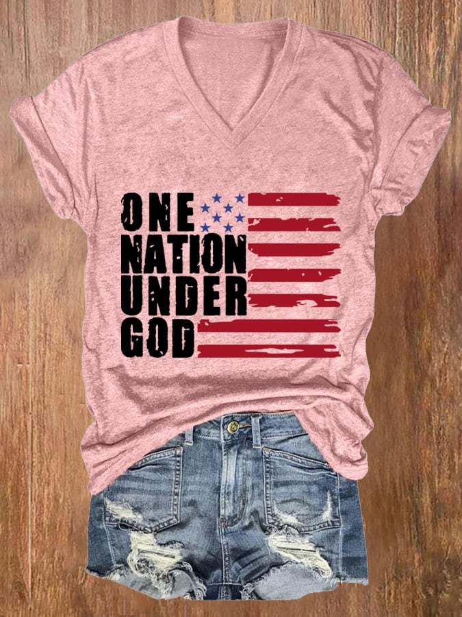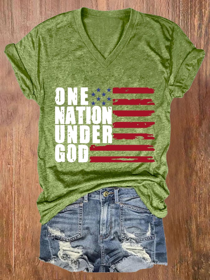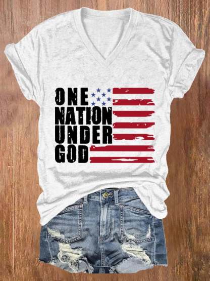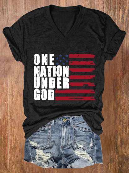 Women's One Nation Under God Print Casual V Neck T-shirt
