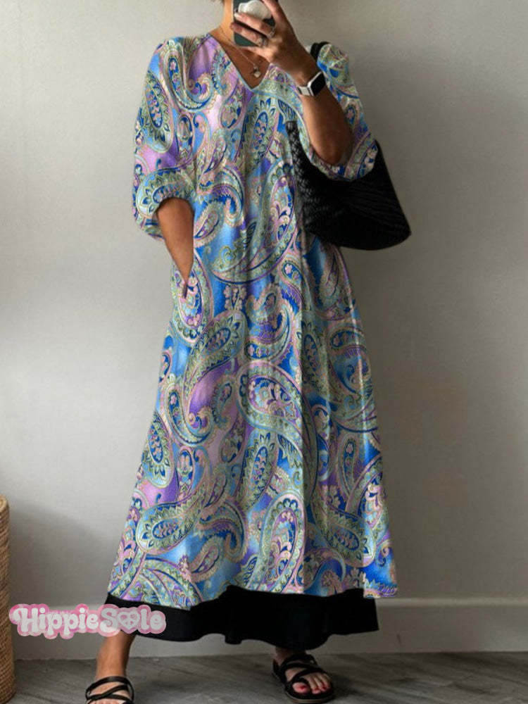 Women's Paisley Floral Art Print Pocket V-neck Cotton Dress