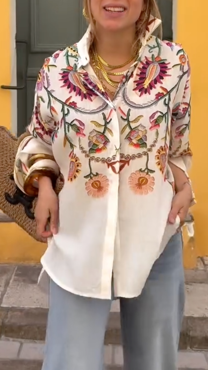 2. Design Details:Featuring a turn-down collar and long sleeves, this garment is adorned throughout with richly colored, ethnic-style floral embroidery; the cuffs can be rolled up, while the neckline and front placket are accented with exquisite decorative stitching.