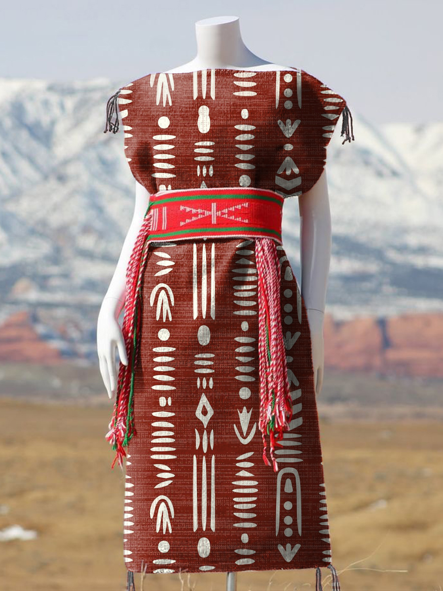 Women's Red Tribal Abstract Symbol Sleeveless Cotton Pocket Wrap V Neck Dress