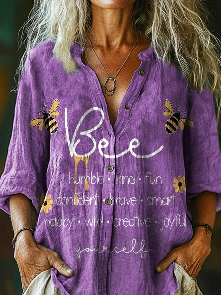 Women's Retro Bee and Letter Art Print Casual Cotton Linen Shirt
