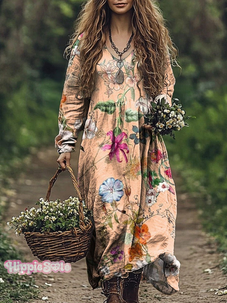 Women's Retro Bright Color Floral Art Print Pocket Cotton Dress