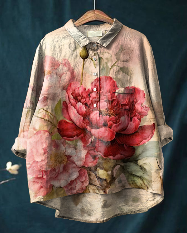 Women's Retro Chic Floral Print Casual Cotton and Linen Shirt