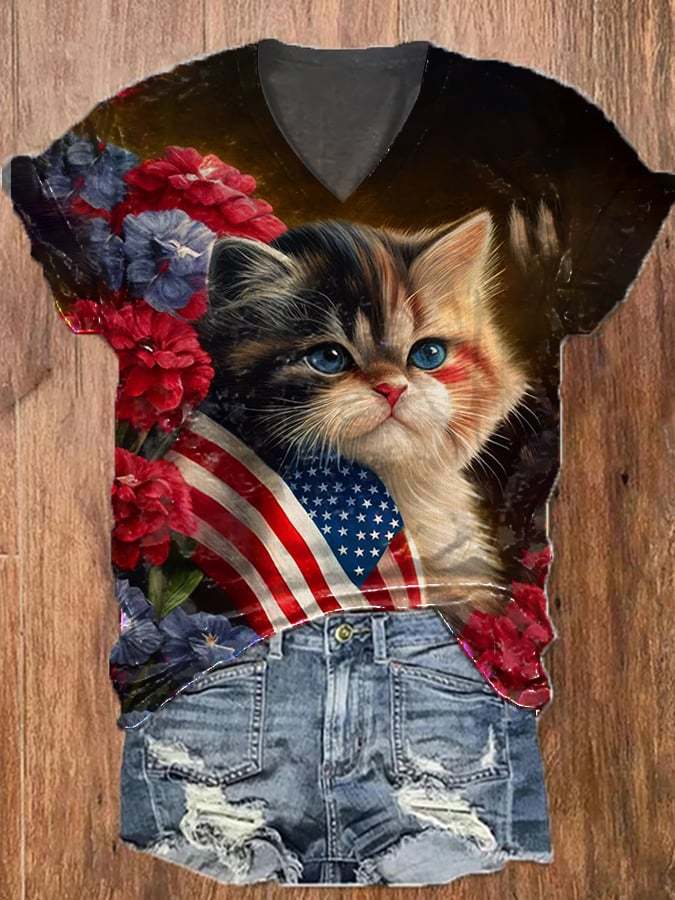 Women's Retro Distressed American Flag Cat Print Casual T-Shirt
