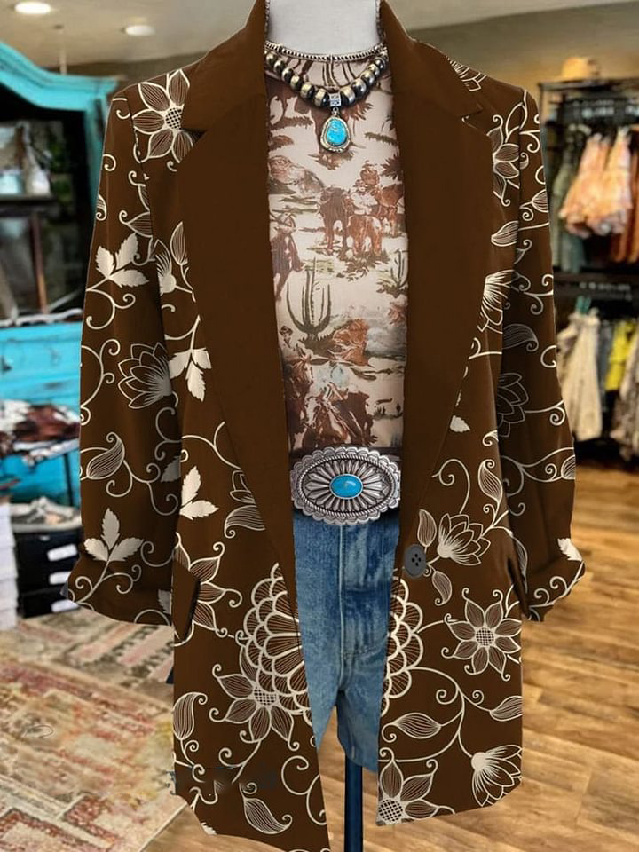 Women's Retro Earthy Yellow Flowers Print 3/4 Sleeve Casual Blazer