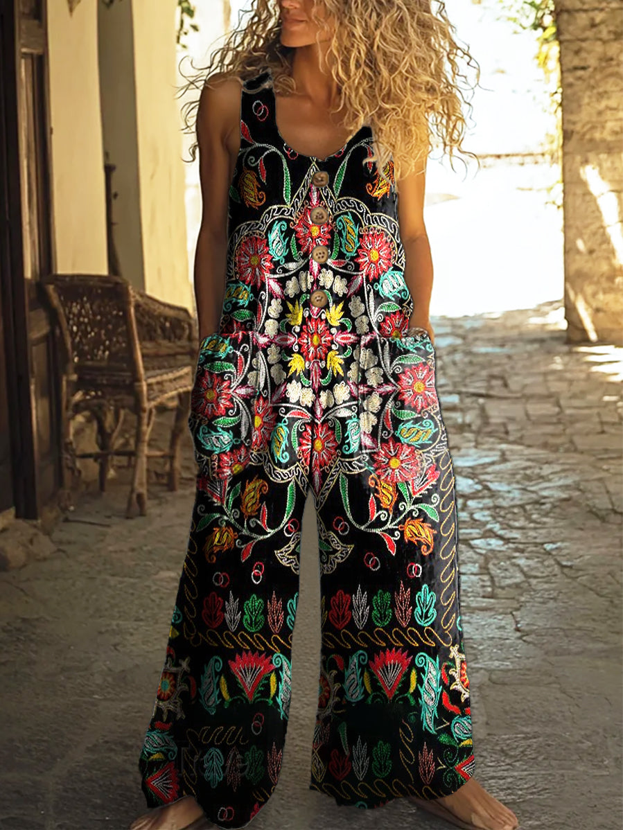 Women's Retro Ethnic Floral Art Print Casual 100% Cotton Wide Leg Jumpsuit