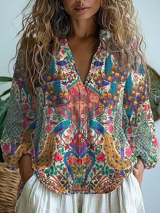 Women's Retro Floral Art Print Casual Long Sleeve Comfortable Cotton Shirt
