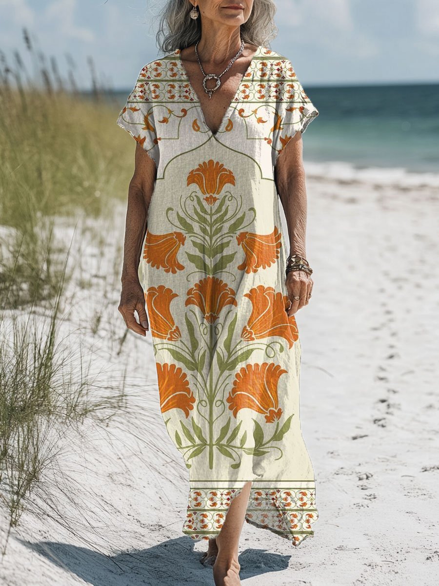 Women's Retro Floral Art Print Pocket Cotton Dress