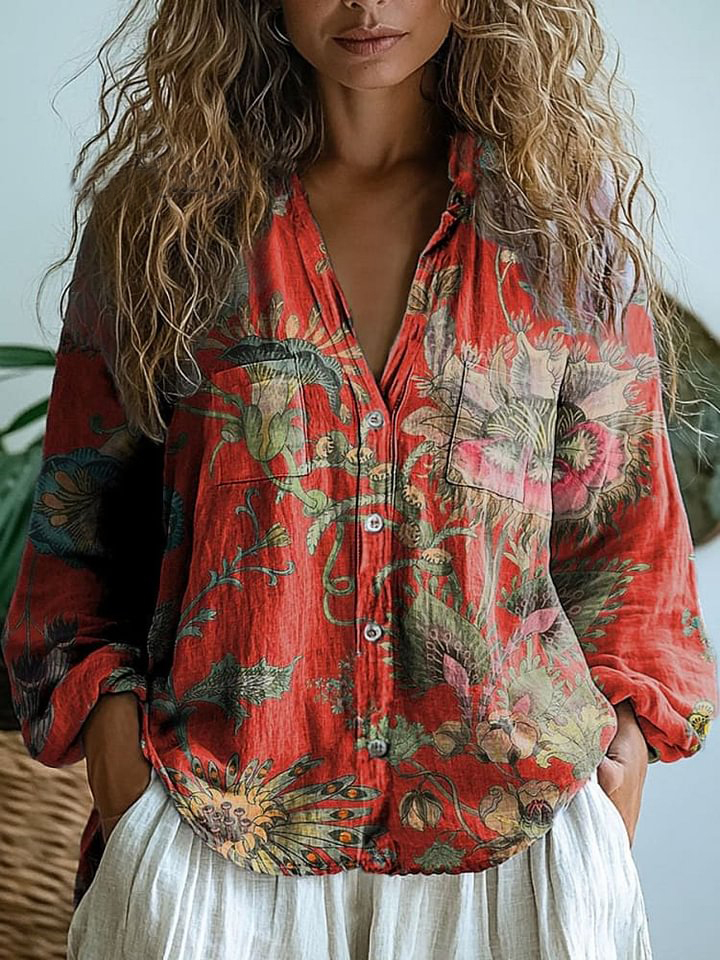 Women's Retro Floral Print Casual Long Sleeve Comfortable Cotton Shirt
