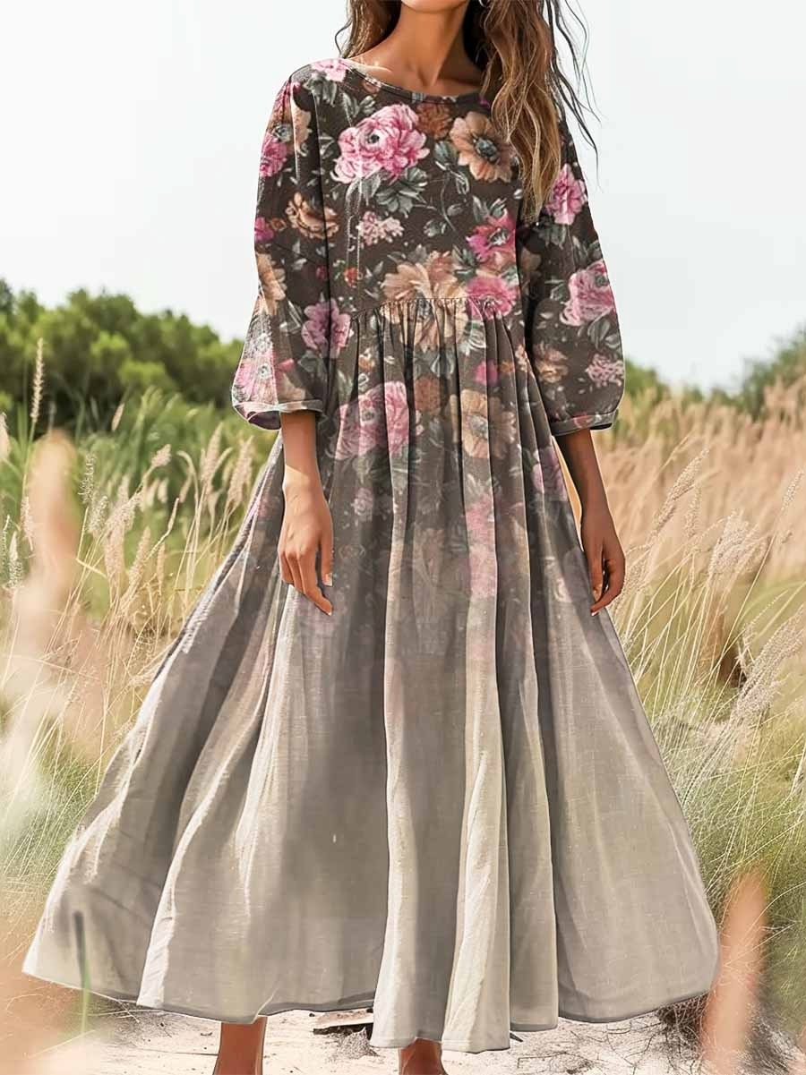 Women's Retro Gradient Floral Art Print Flowy Cotton Crew Neck Dress