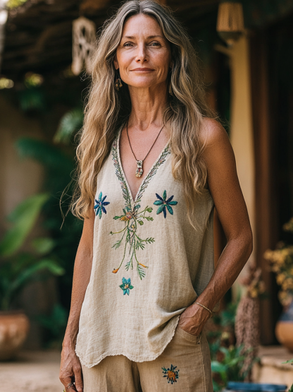 Women's Retro Loose Bohemia Ethnic Style Linen V-neek Sleeveless Top