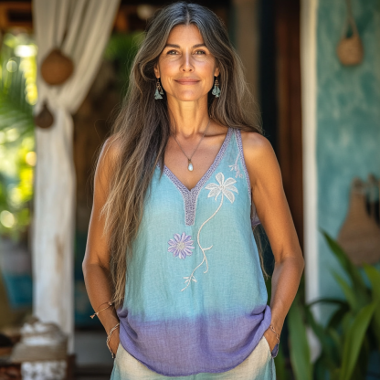 Women's Retro Loose Gradient Bohemia Ethnic Style Linen V-neek Sleeveless Top