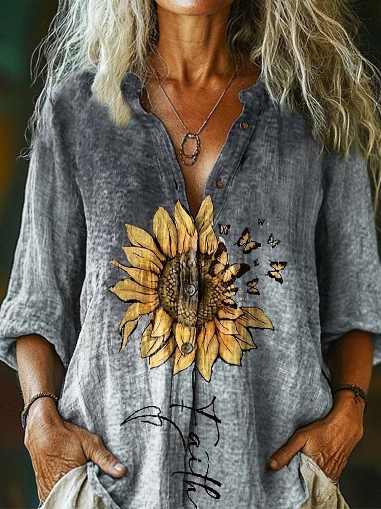 Women's Retro Sunflower Faith Art Print Casual Cotton Linen Shirt
