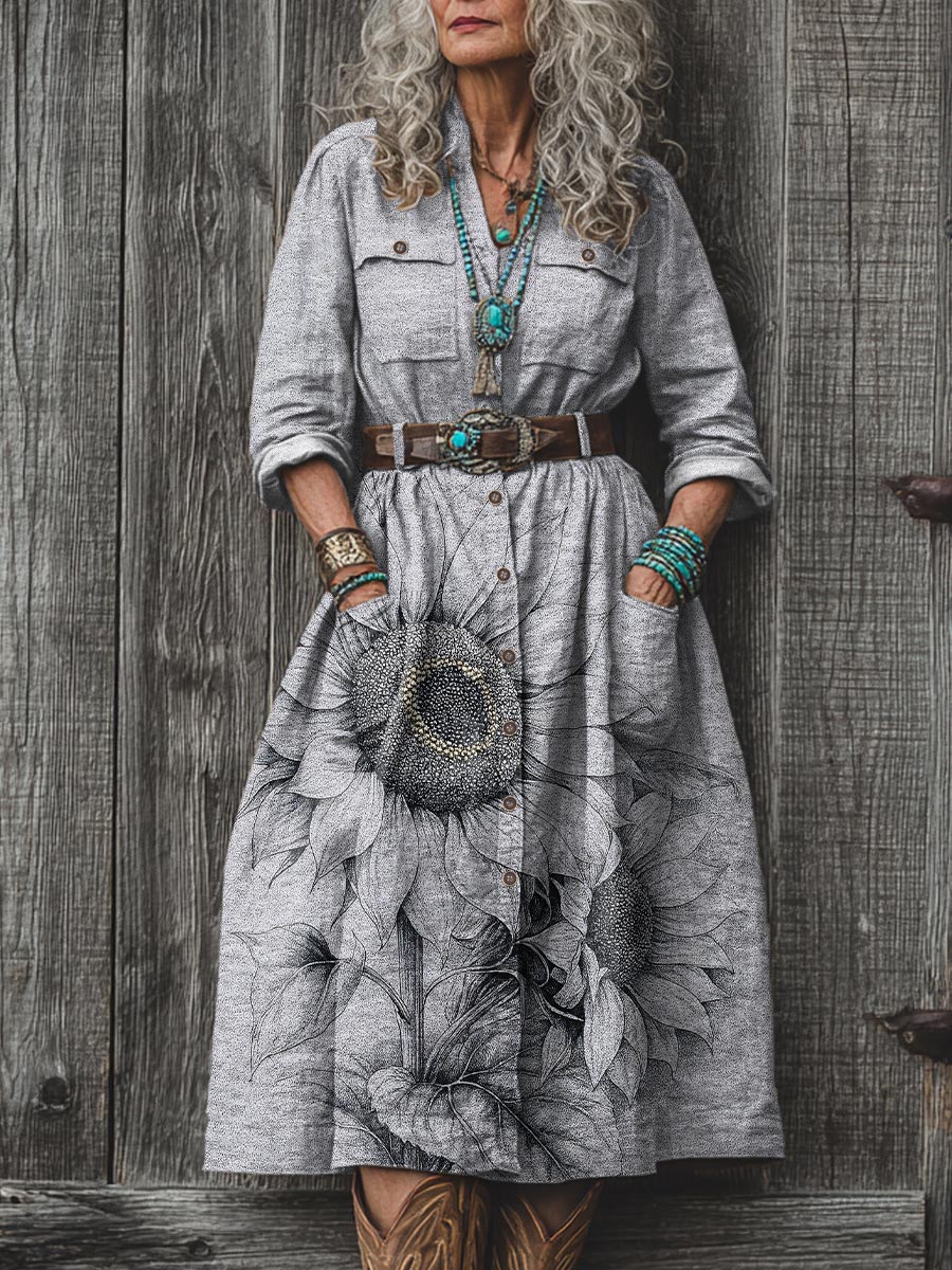 Women's Retro Texture Flower Art Print Dress