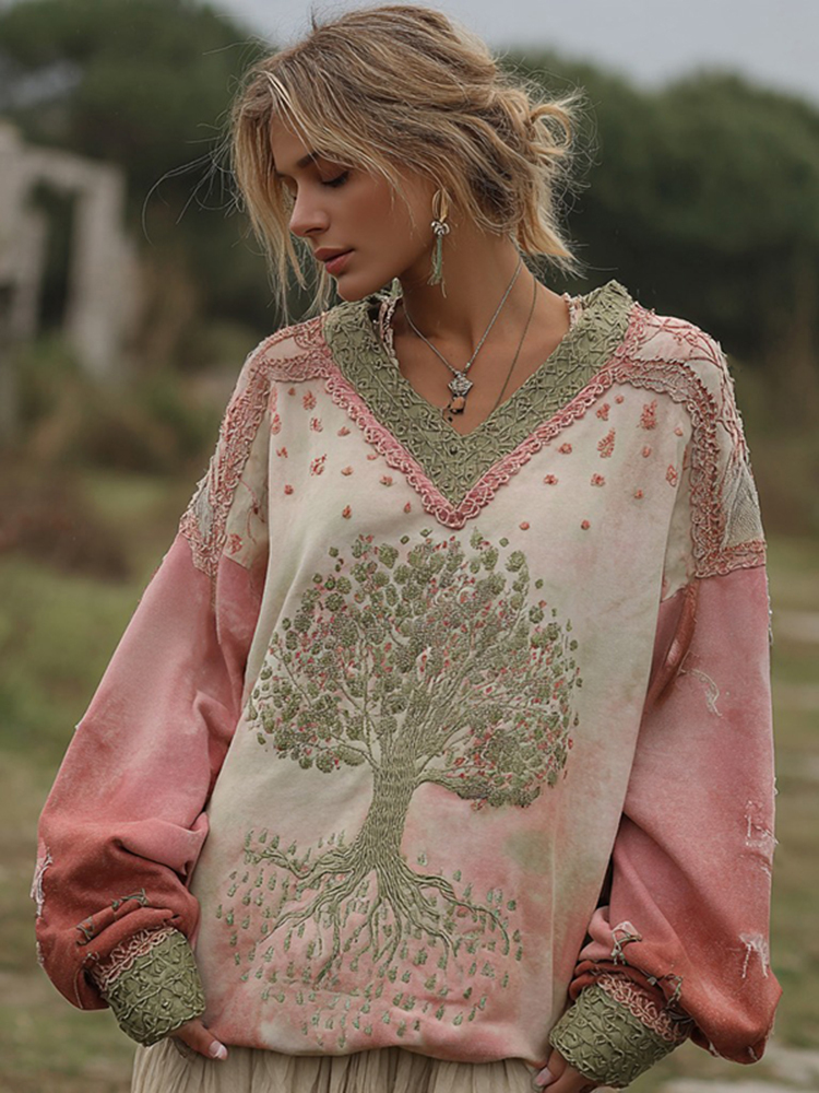 Women's Retro Viking Tree Of Life Stitching Warm V-neck Sweatshirt