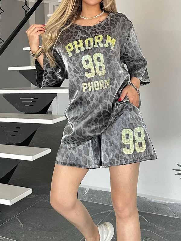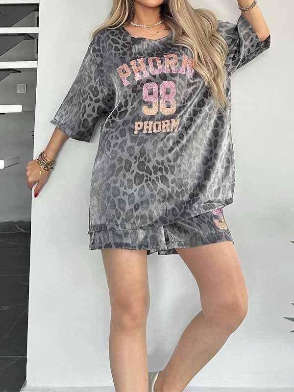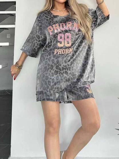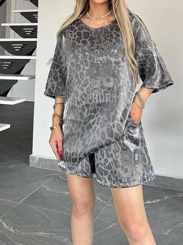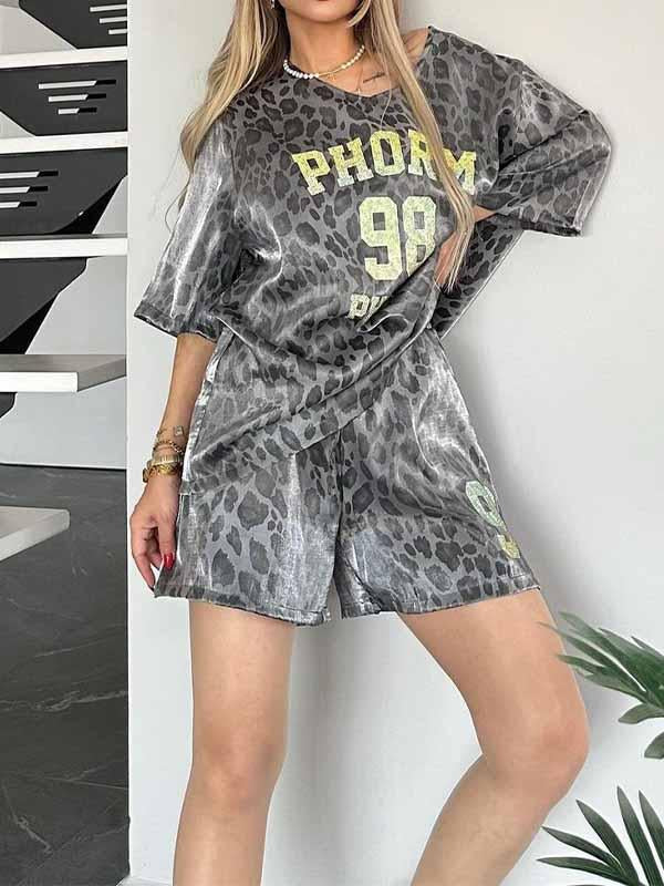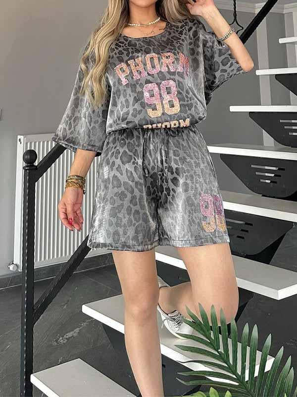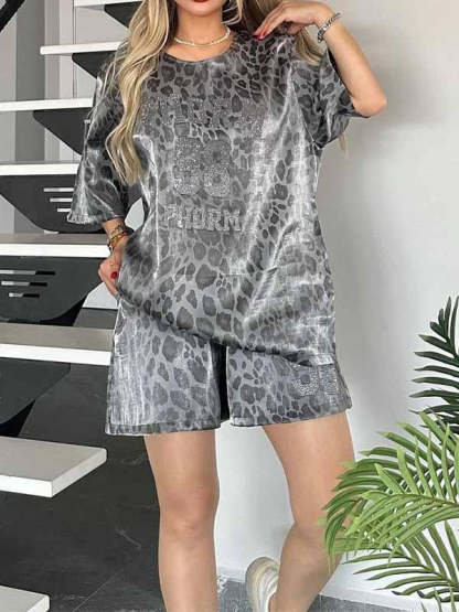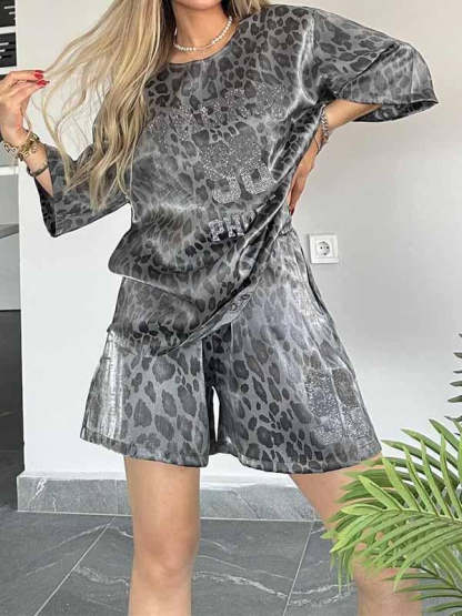 Women's Round Neck Leopard Print Short Sleeve Two Piece Suit