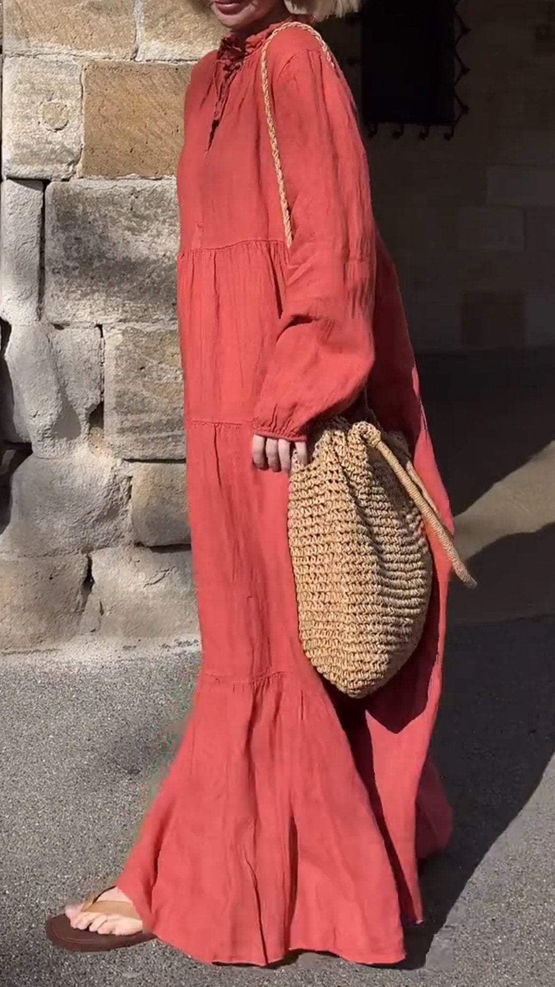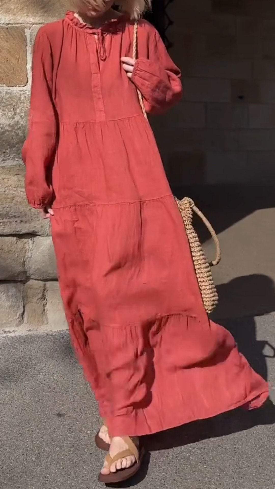 Women's Round Neck Long Sleeve Casual Cotton and Linen Dress