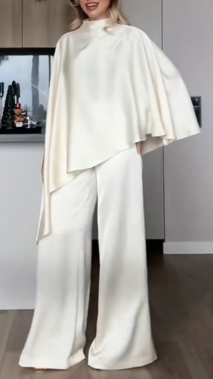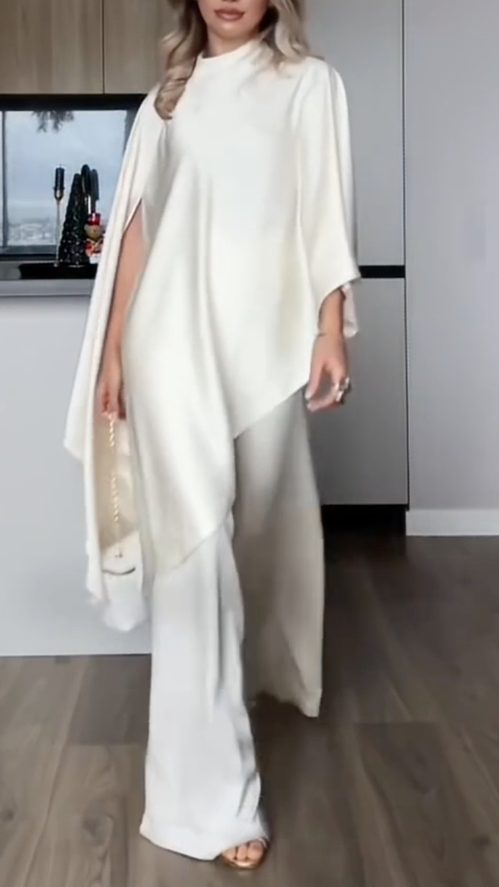 2. Design Details: This two-piece set features an off-the-shoulder/straight neckline, loose batwing sleeves with side slits, and an irregular, asymmetrical hem, creating a relaxed yet stylish look. The high-waisted wide-leg pants are floor-length with a beautiful drape, visually elongating the legs.