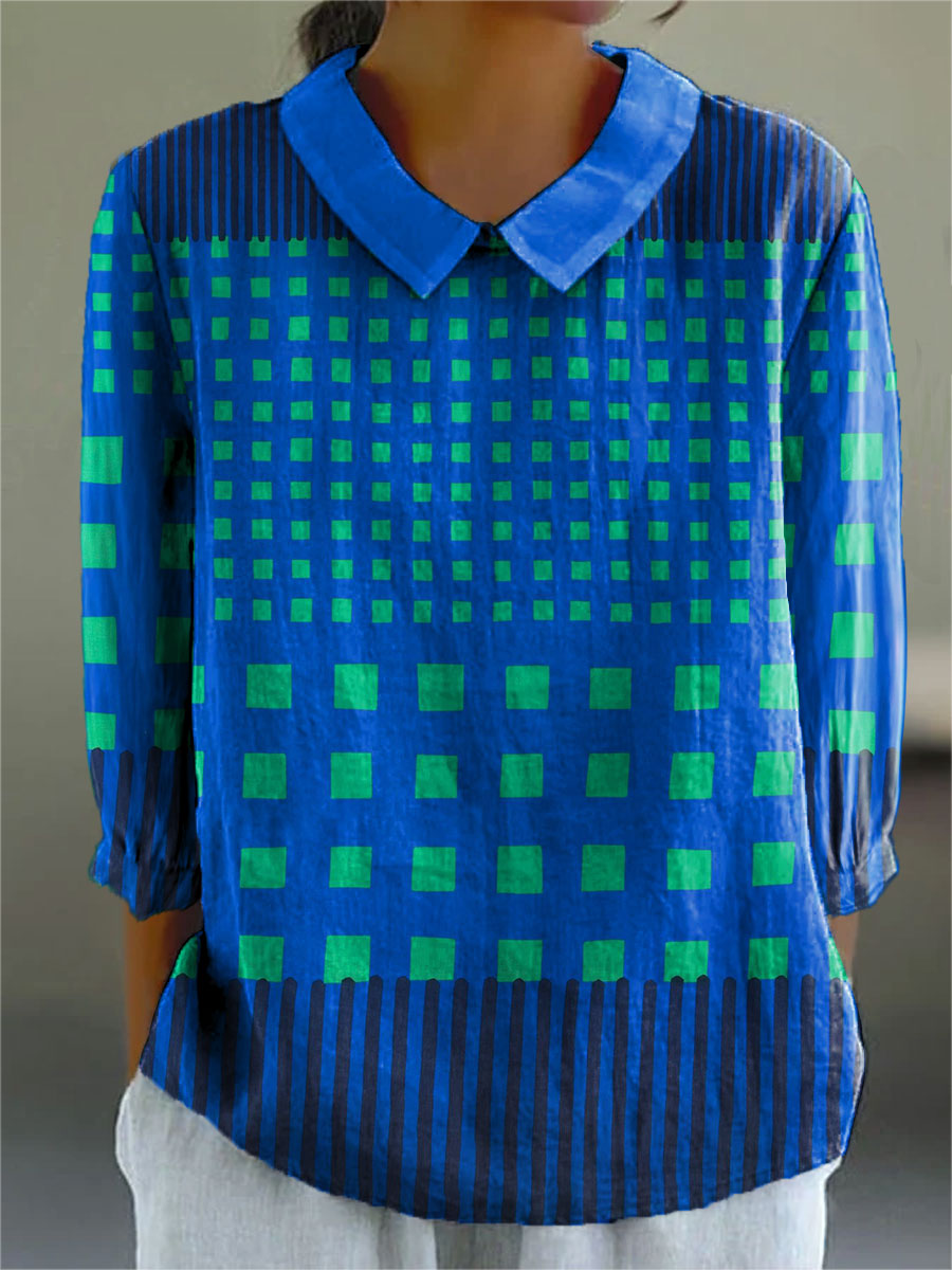 Women's Simple Color Block Art Print Casual Cotton And Linen 3/4 Sleeve Shirt