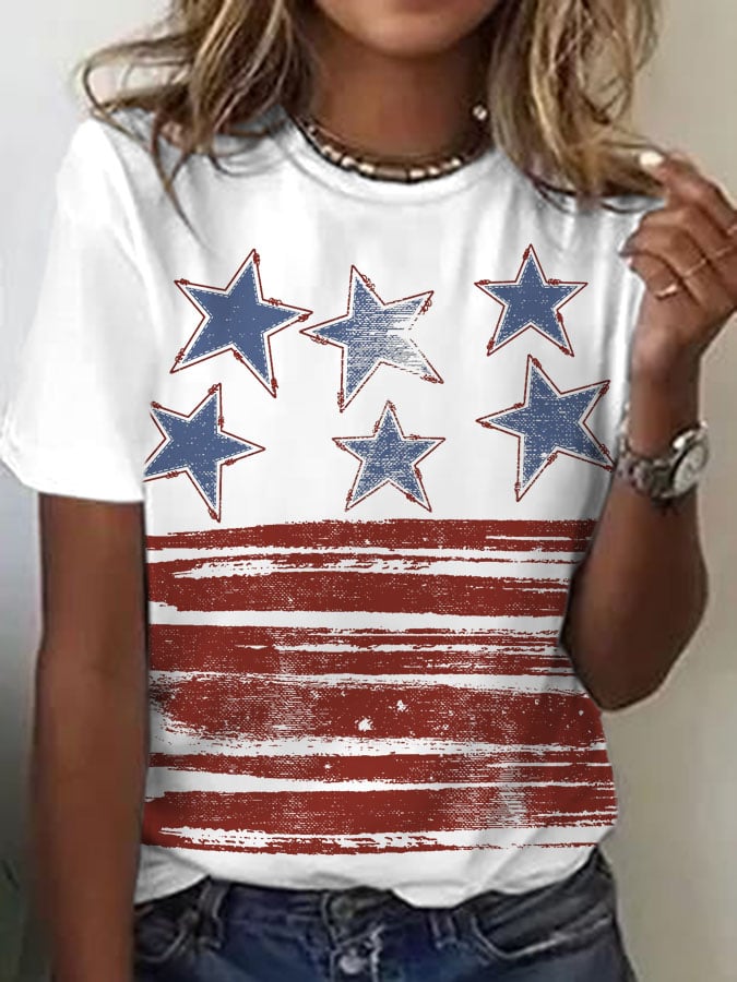 Women's Stars And Stripes Print Round Neck T-shirt