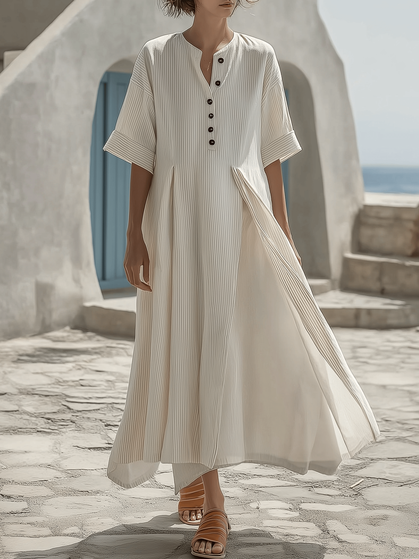 Women's Summer Round Neck Striped Pleated Dress