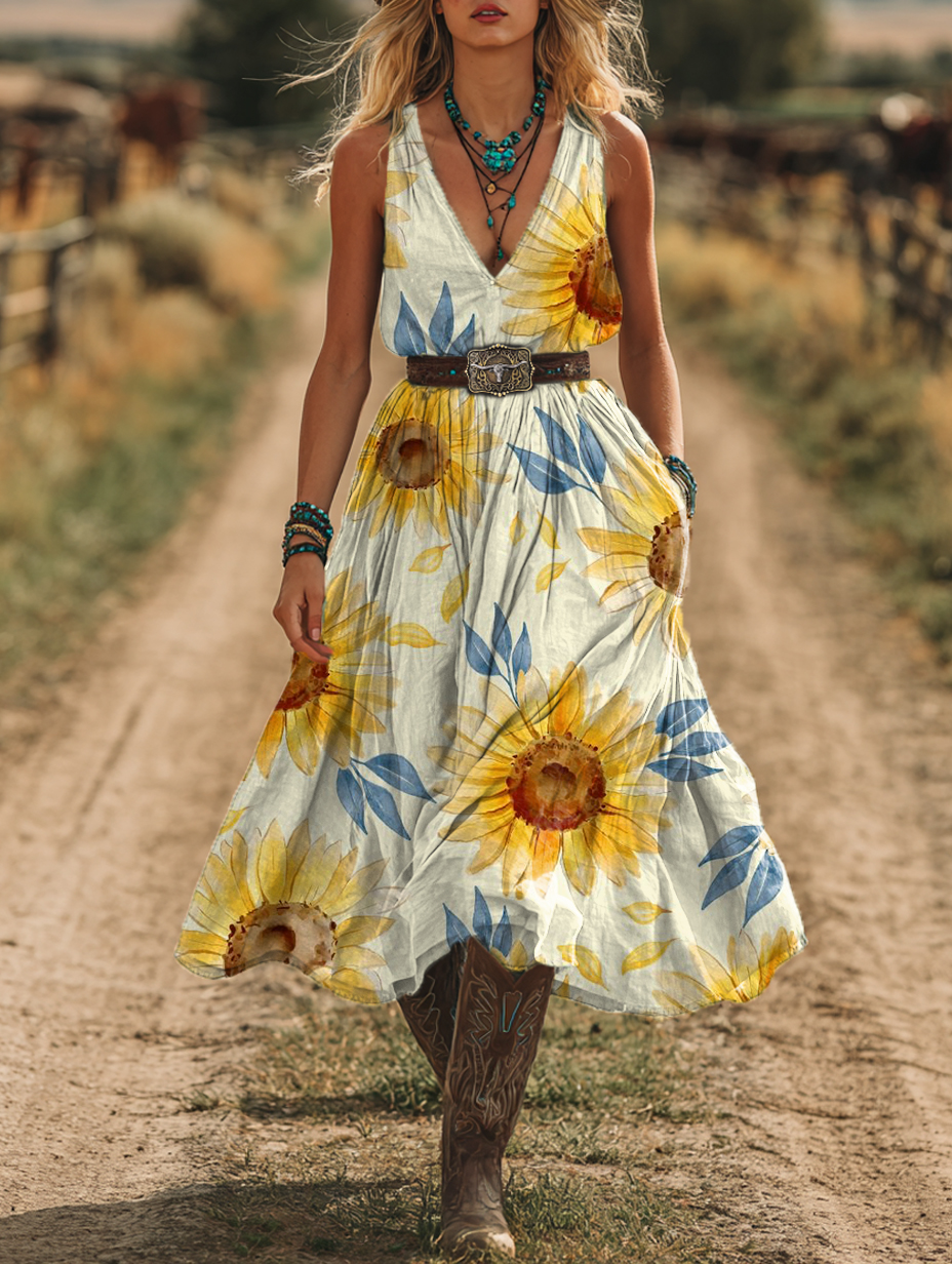 Women's Sunflower Print Sleeveless Cotton and Linen Pocket Dress
