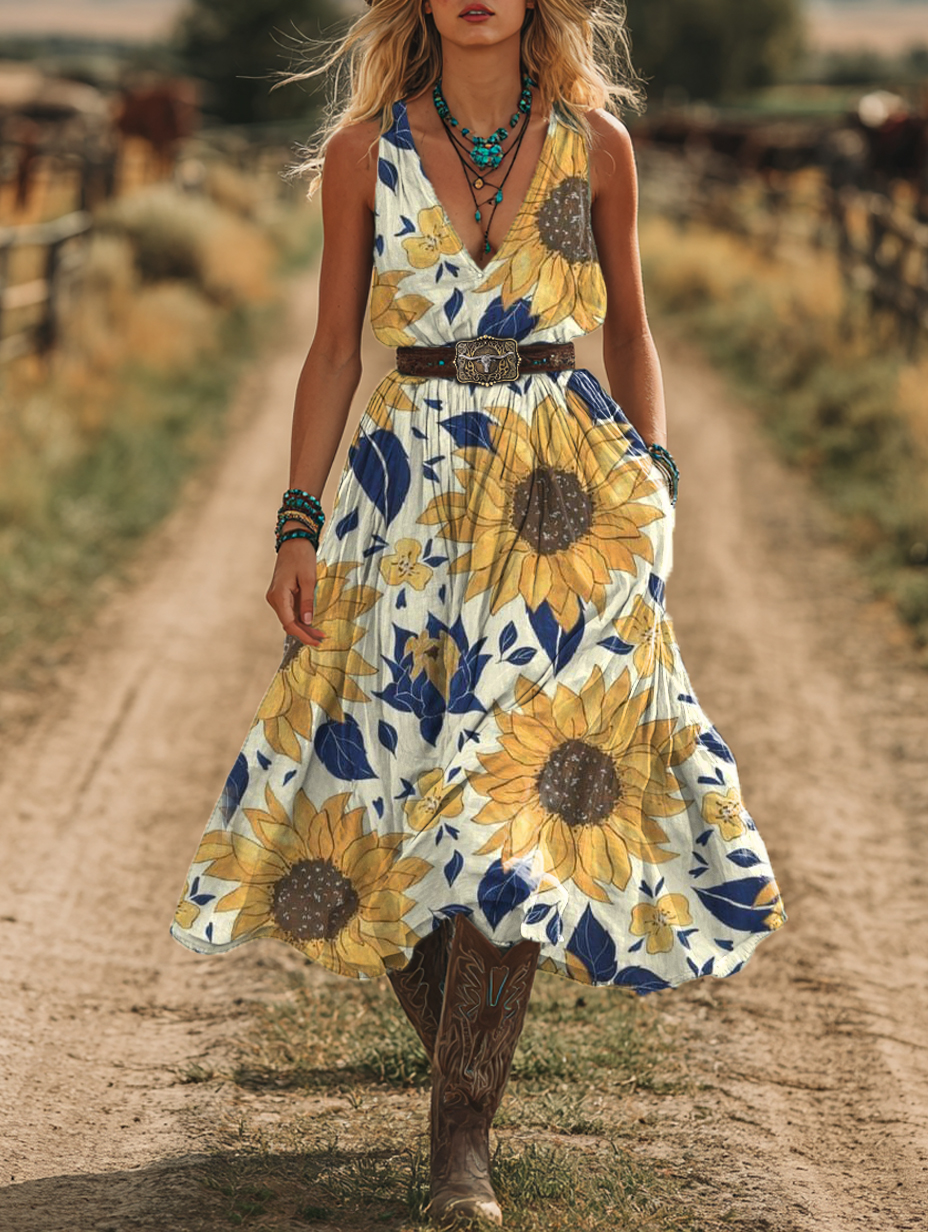 Women's Sunflower Print Sleeveless Cotton and Linen Pocket Dress