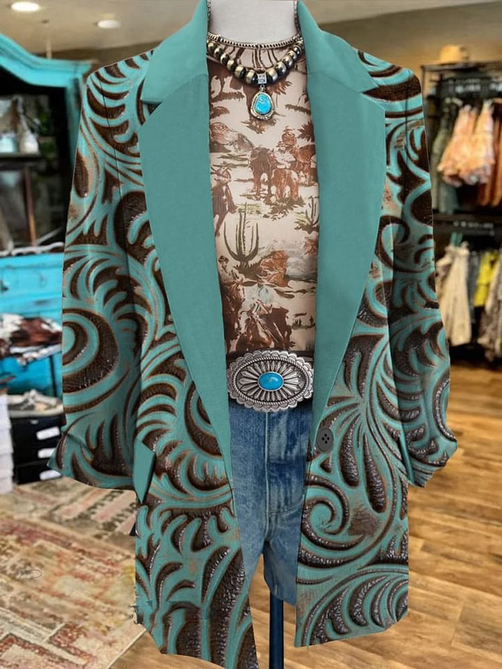 Women's Turquoise Vintage Flower Print 3/4 Sleeve Casual Blazer