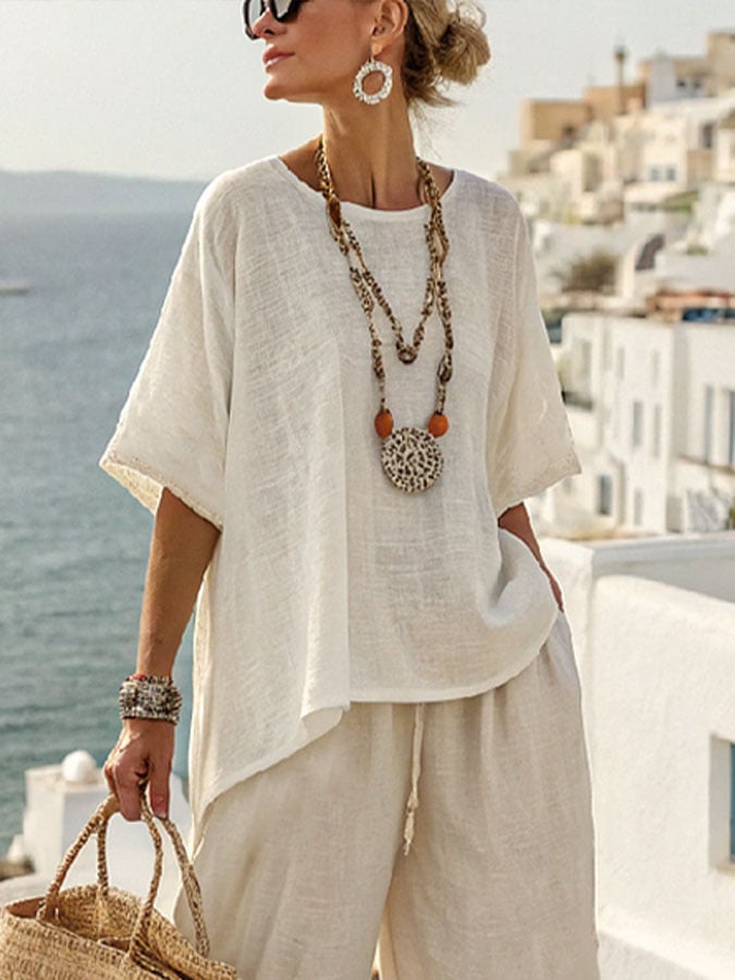 Women's Vacation Round Neck Short Sleeve Solid Color Loose Top Pants Cotton and Linen Suit