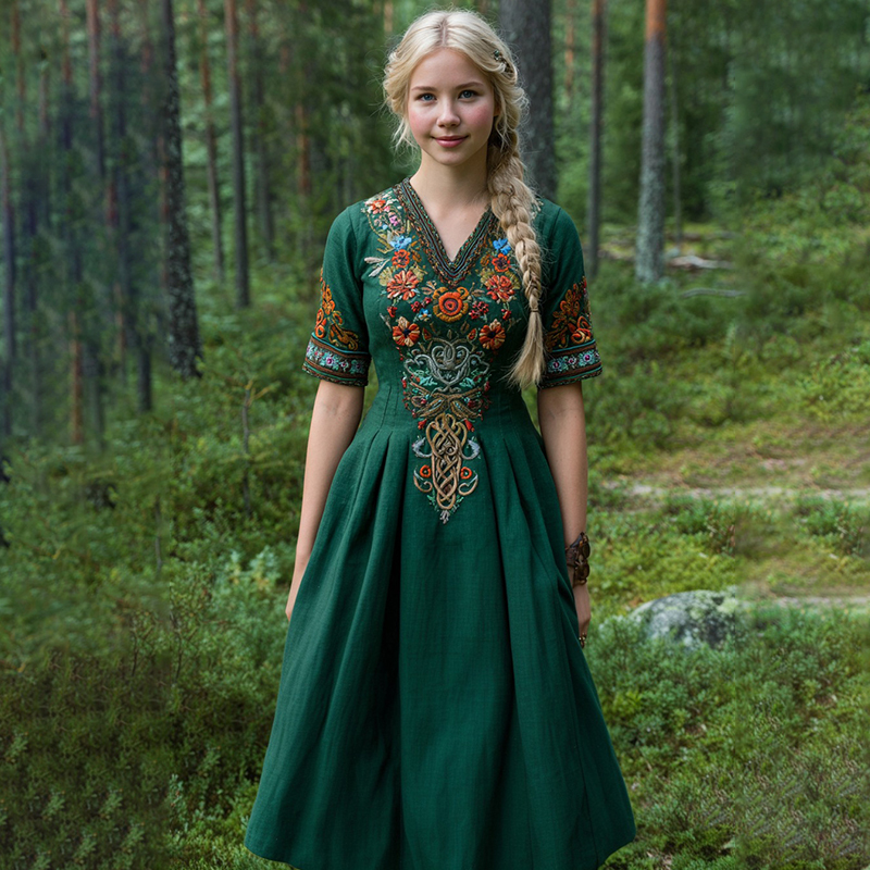 Women's Viking Celtic Floral Embroidery Art Casual Short Maxi Dress