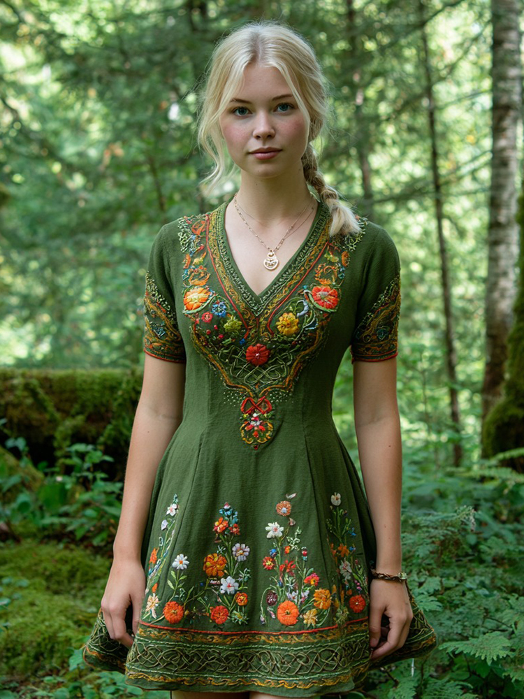 Women's Viking Celtic Floral Embroidery Art Casual Short Mini Dress