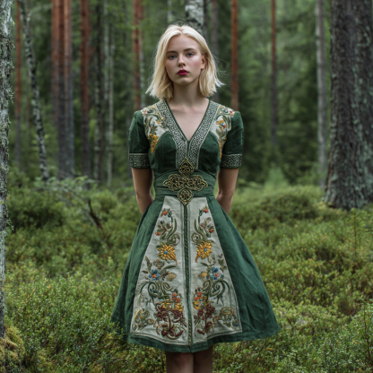 Women's Viking Celtic Floral Embroidery Patchwork Art Casual Short Mini Dress