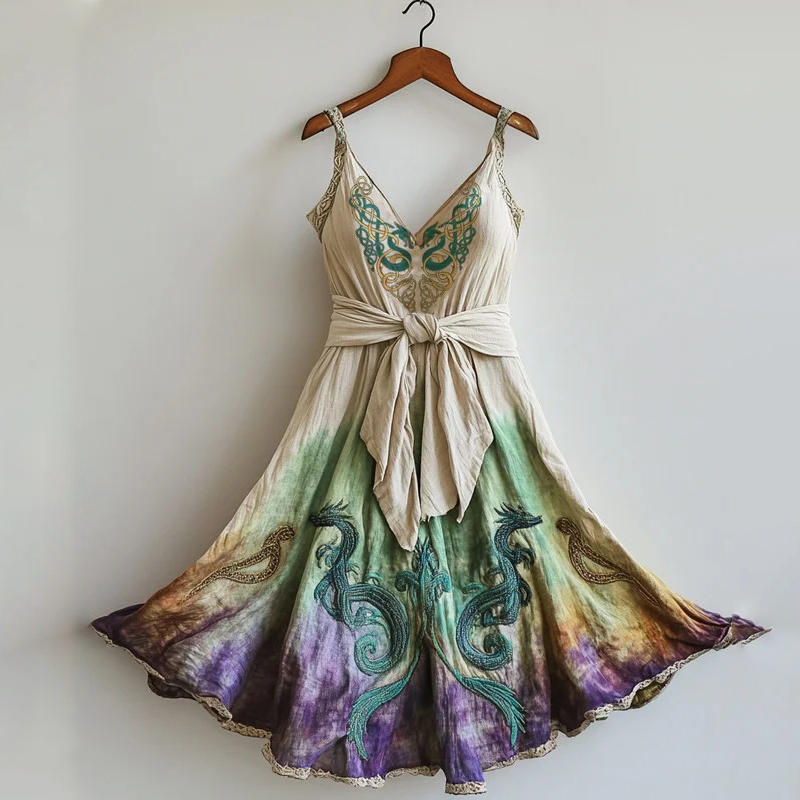 Womens Viking Celtic Knot Ombre Art Linen Short Midi Dress