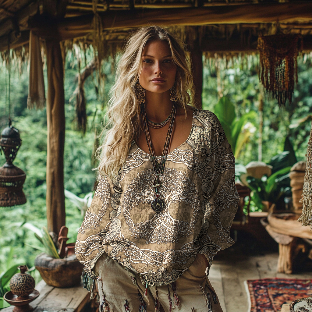 Women's Viking Celtic Knot Style Tree Of Life Art Linen Casual T-shirt