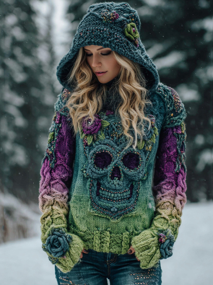 Women's Viking Tribal Jacquard Celtic With Rose And Skull Inspired Chunky Knit Hooded Sweater