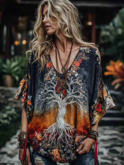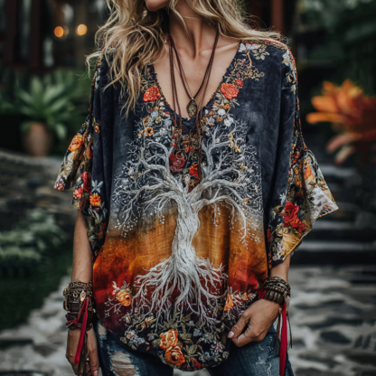Women's Viking Tribal Tree Of Life And Floral Embroiderd In Rainbow Art Casual Shirt